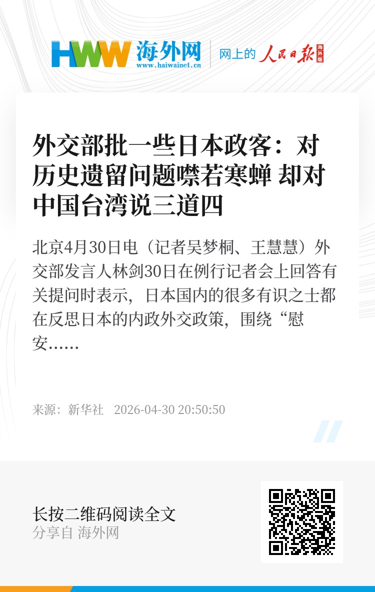 新华社北京4月30日电(记者吴梦桐、王慧慧)外交部发言人林剑30日在例行记者会上回答有关提问时表示,日本国内的很多有识之士都在反思日本的内政外交政策,围绕“慰安妇”、强征劳工等历史遗留问题和日本国内的原住民、少数族裔权利等问题也有很多讨论。一些日本政客对这些问题要么噤若寒蝉,要么装聋作哑,却对中国台湾说三道四,真正的意图究竟是什么,恐怕只有他们自己最清楚。