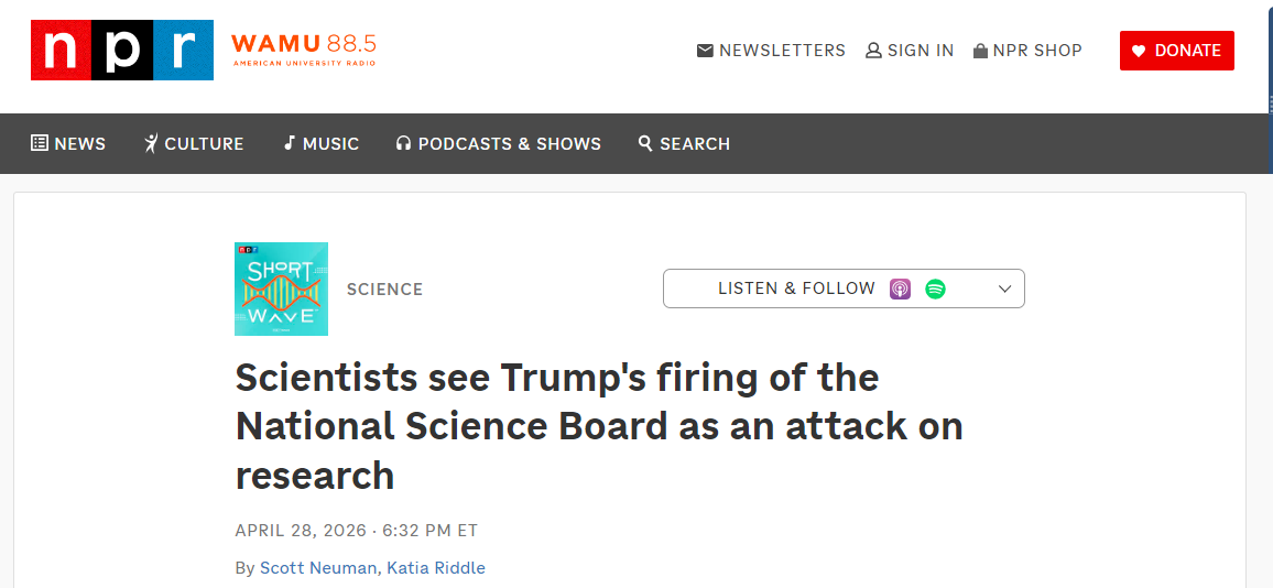 美国国家公共广播电台(NPR)报道指出,此举发生在特朗普政府推动大幅削减NSF预算的背景下,包括2026财年初步预算要求削减47亿美元,超过该机构90亿美元预算的一半,政府还撤销了数千项已获批的国家科学基金会资助项目。