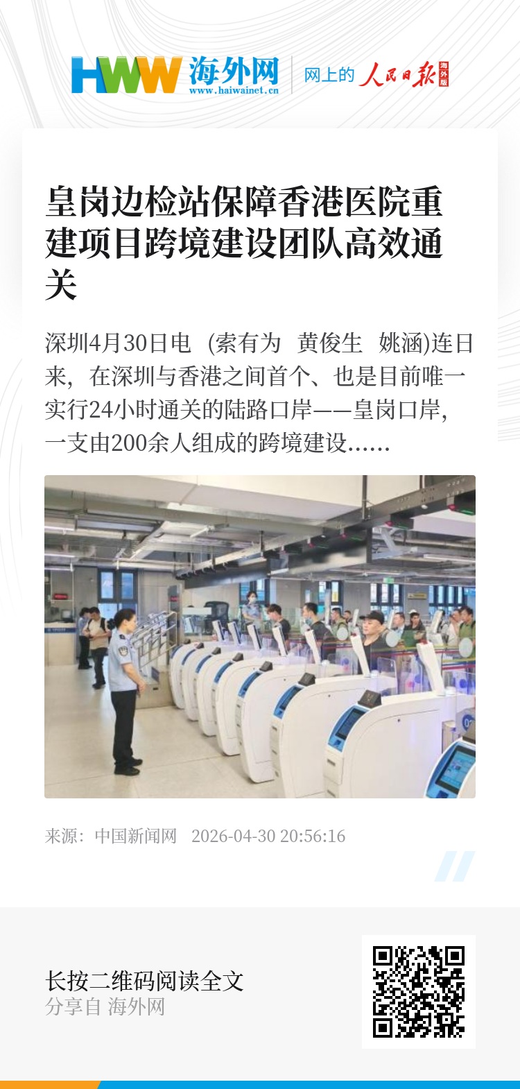 中新网深圳4月30日电 (索有为 黄俊生 姚涵)连日来,在深圳与香港之间首个、也是目前唯一实行24小时通关的陆路口岸——皇岗口岸,一支由200余人组成的跨境建设队伍,每日高效、有序地往返于深港两地。他们的目的地,是香港重要的民生工程——威尔斯亲王医院第二期重建项目现场。