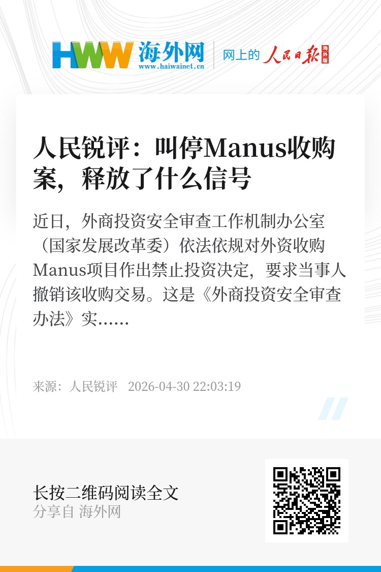 近日,外商投资安全审查工作机制办公室(国家发展改革委)依法依规对外资收购Manus项目作出禁止投资决定,要求当事人撤销该收购交易。这是《外商投资安全审查办法》实施以来首个被公开叫停的AI领域外资收购案,也是该办法框架下最严的一档审查结论。