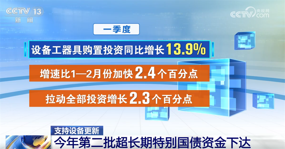 在设备更新政策带动下,一季度设备工器具购置投资同比增长13.9%,增速比1—2月份加快2.4个百分点,拉动全部投资增长2.3个百分点。