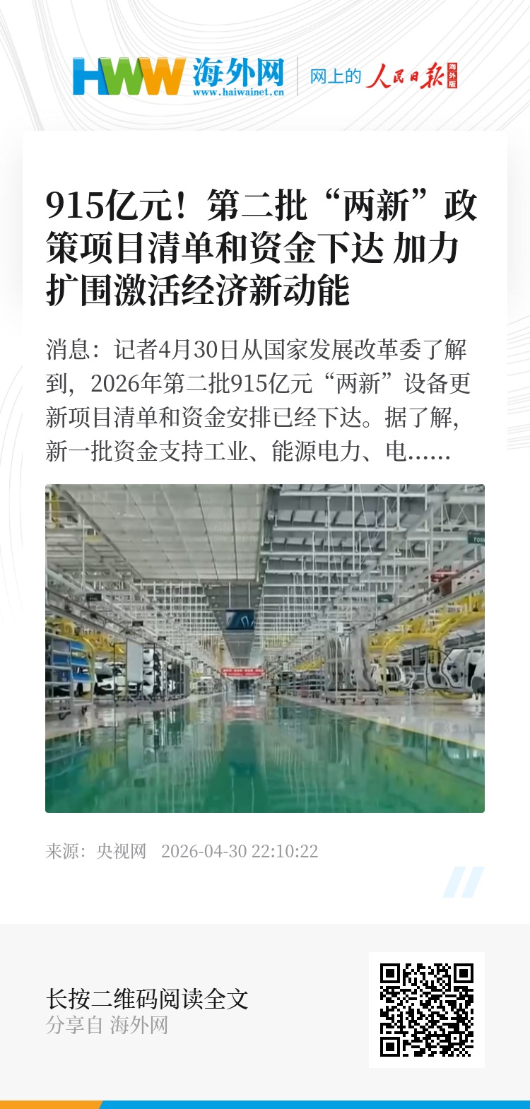 央视网消息:记者4月30日从国家发展改革委了解到,2026年第二批915亿元“两新”设备更新项目清单和资金安排已经下达。