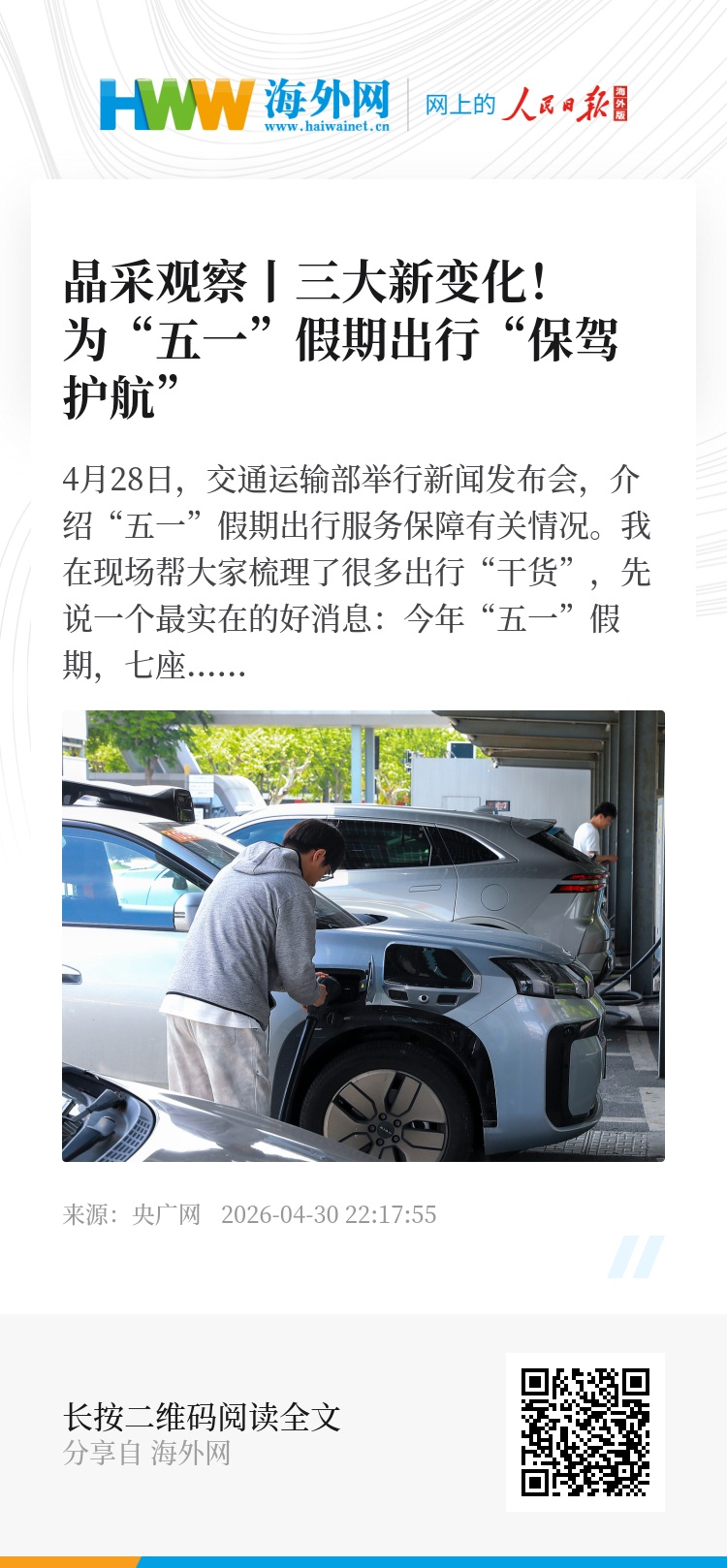 交通运输部相关负责人介绍,交通运输部已经指导各地加快充电基础设施建设,确保在“五一”假期前建成投用一批充电枪,持续提升充电能力。节日期间,将加强监测调度,对于充电特别繁忙的服务区,综合运用增设移动充电设备、加强充电秩序管理、引导至对向服务区或高速公路出入口附近充电等多种方式,有效缓解充电排队压力。